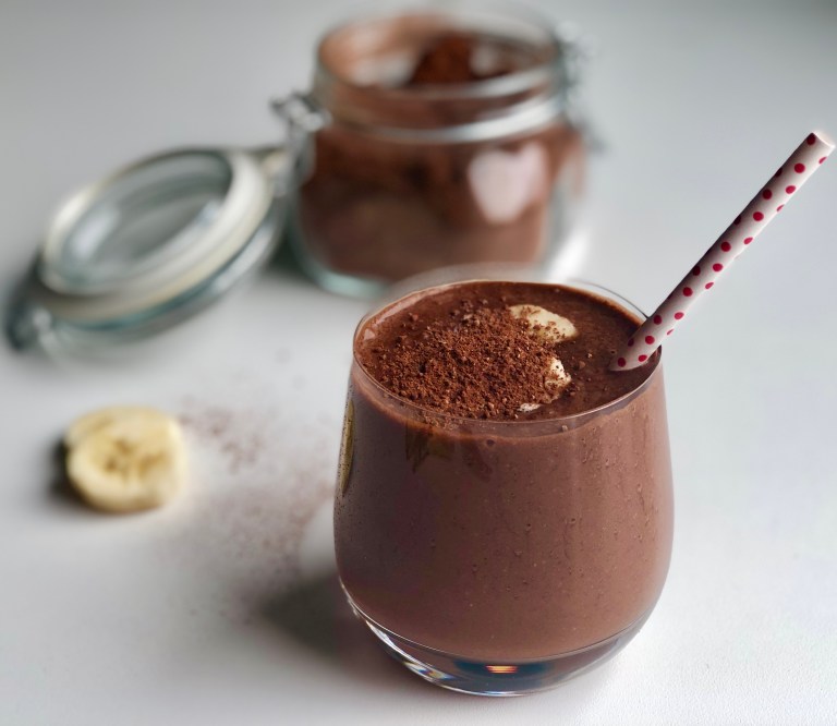 Hell det over i et stort glass og pynt med et dryss kakaopulver og bananskiver.