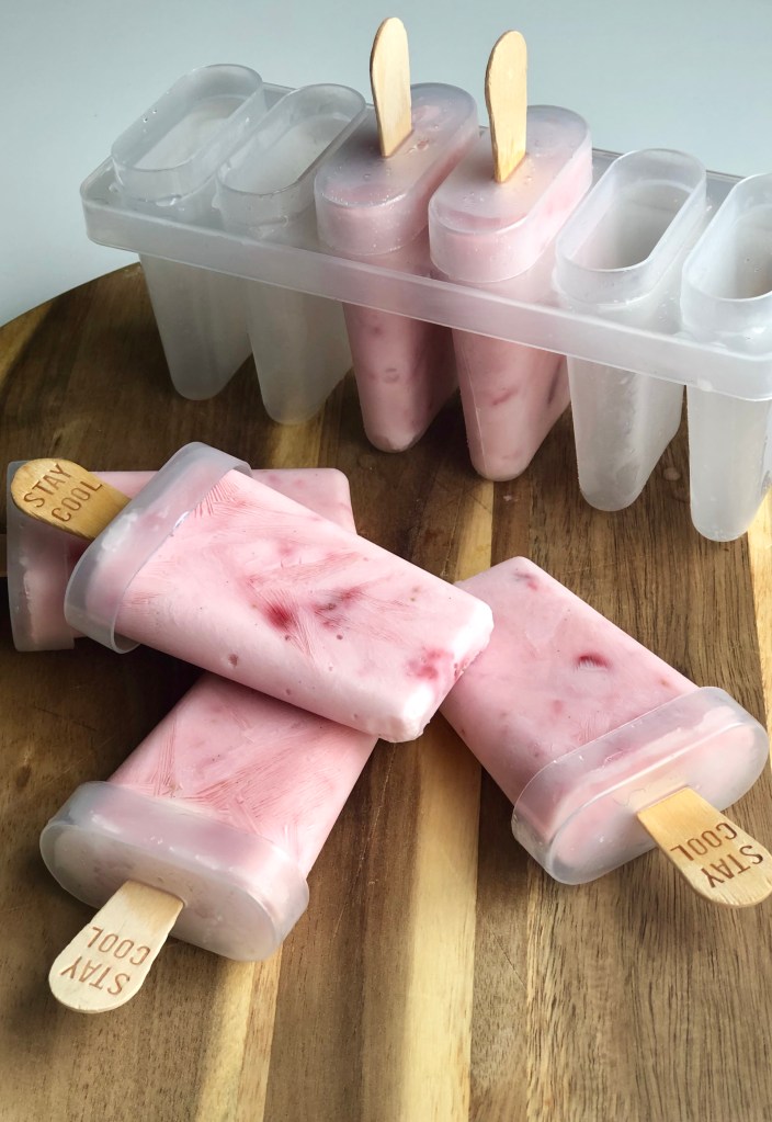 Bland det godt sammen med jordbærene, fyll i ispinneboksene og sett i ispinner.