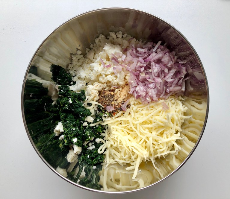 Tilsett mozzarella, løk, hvitløkspulver og chiliflak og bland sammen.