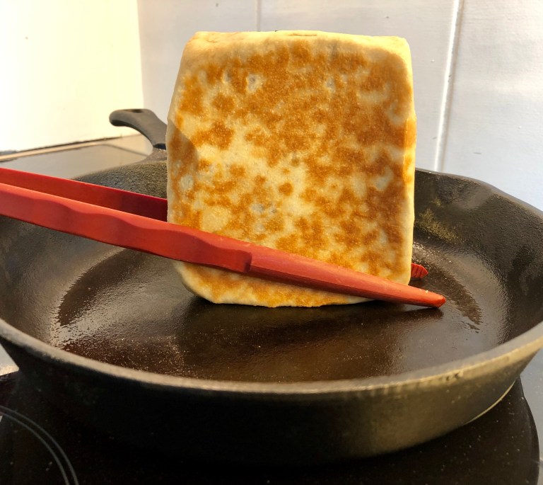 Stekes i 8-10 minutter på den første siden (den som er brettet, fordi den er tykkere)