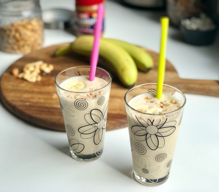 Hell det over i et stort glass og pynt med bananskiver og hakkede peanøtter.