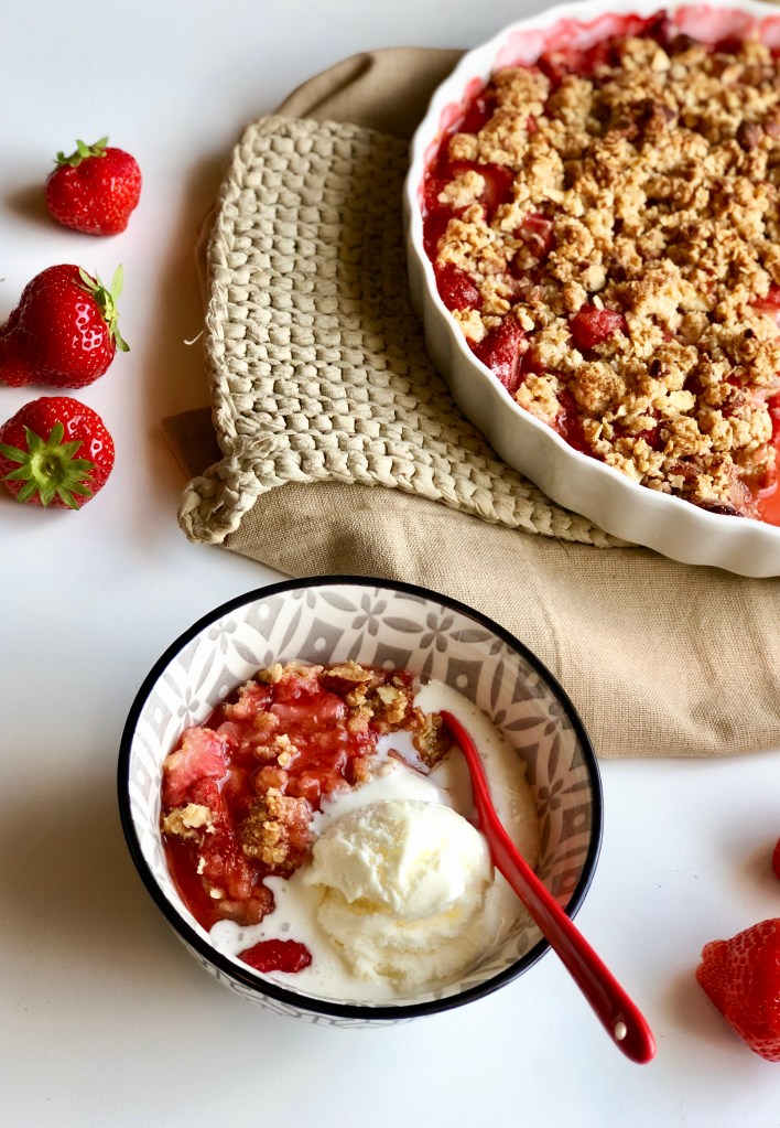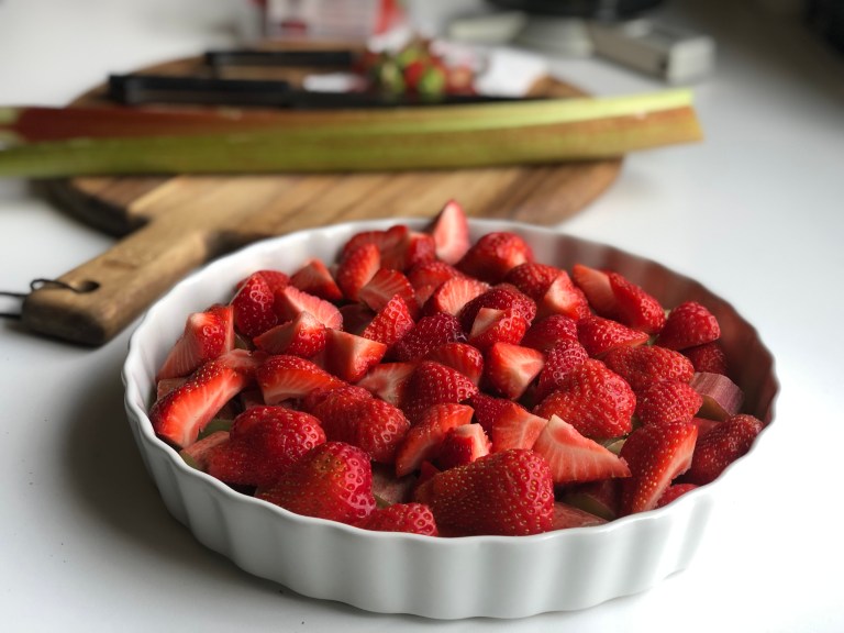 Fordel rabarbra og jordbær i en smurt ildfast form.
