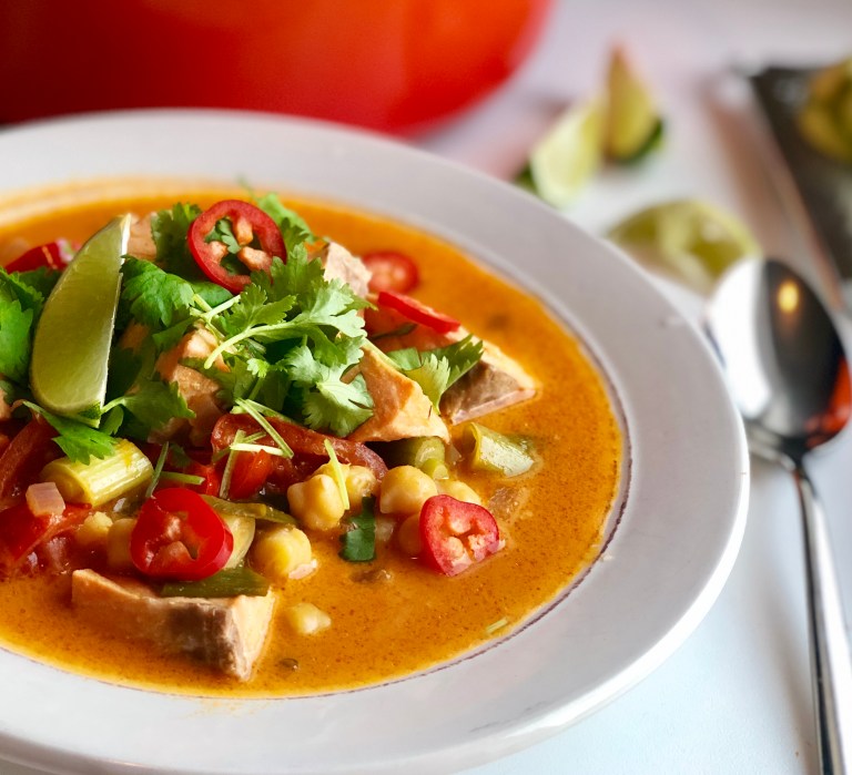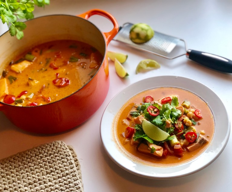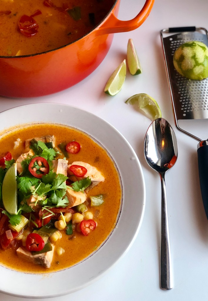 En nydelig sterk fiskesuppe med asiatiske smaker fra kokos, hvitløk, lime og ingefær.