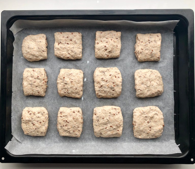 Form en lang pølse, trykk den litt flatere og skjær ut 12 firkanter.
