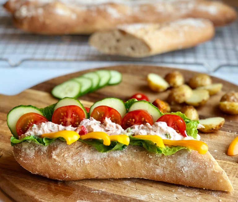 Sett brettet inn midt i ovnen på 220 grader varmluft og stek baguettene i 20-25 min.