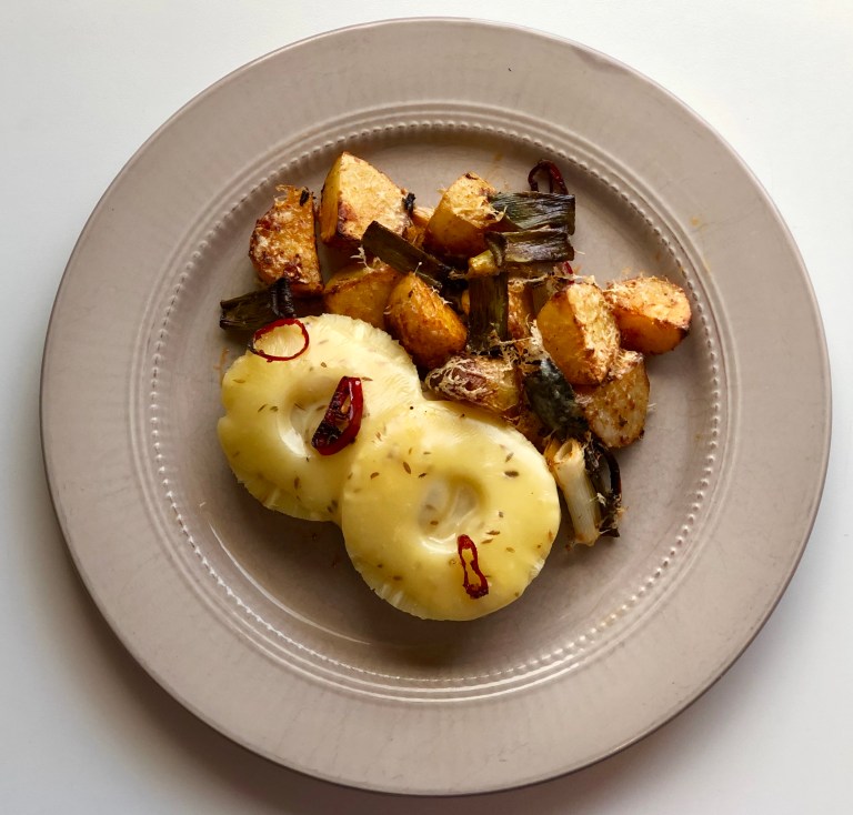 Benfri kotelett med sennep, ananas og nøkkelost med litt sterke chilipoteter.