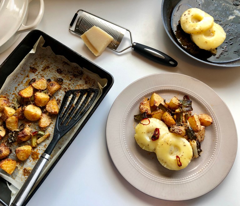 De er ferdige når osten har smeltet. Server med chilipoteter og vårløk.