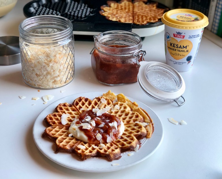Serveres her med hjemmelaget plommesyltetøy, vaniljekesam og ristede kokosflak.