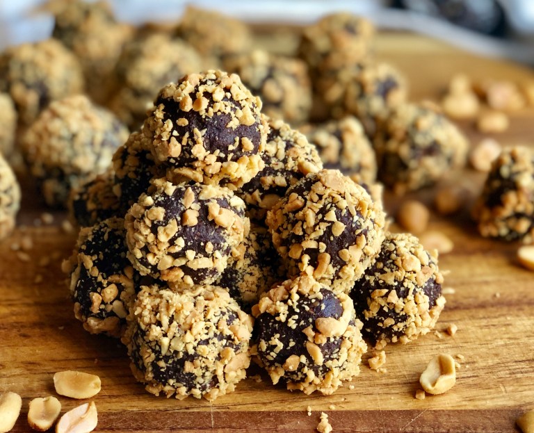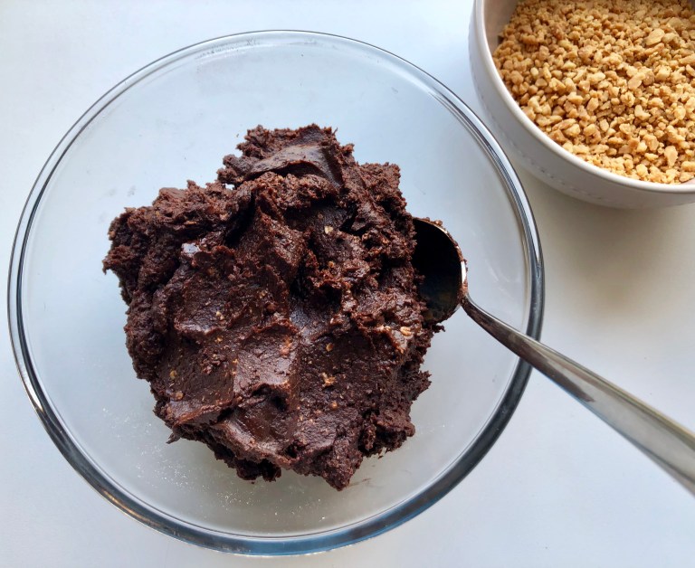 Jeg får 30 kuler av denne mengden. Rull kulene i de hakkede peanøttene.