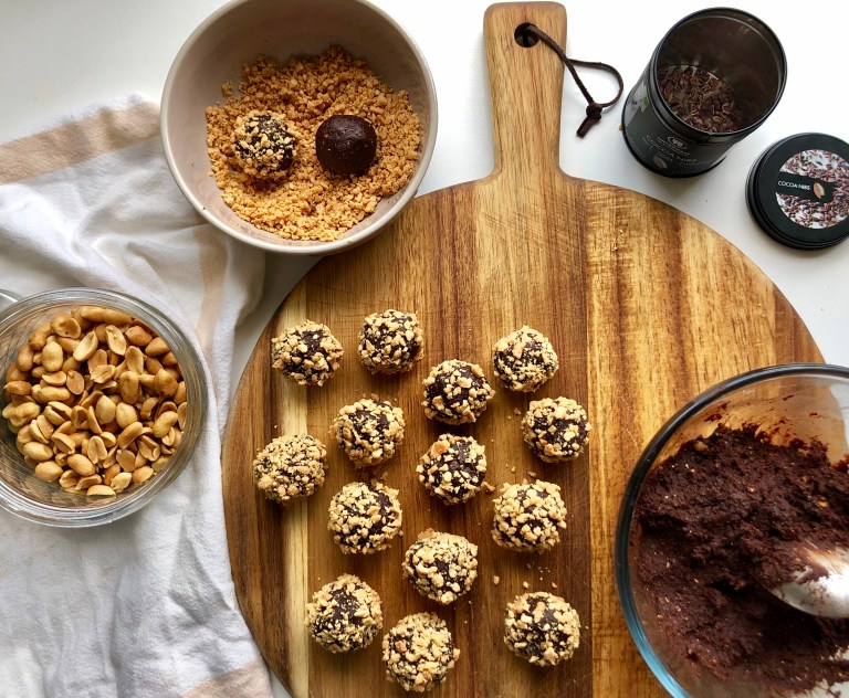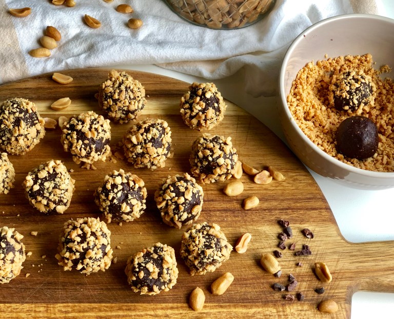 Hakk 100 gram peanøtter fint og ha det i en skål til å rulle kulene i.