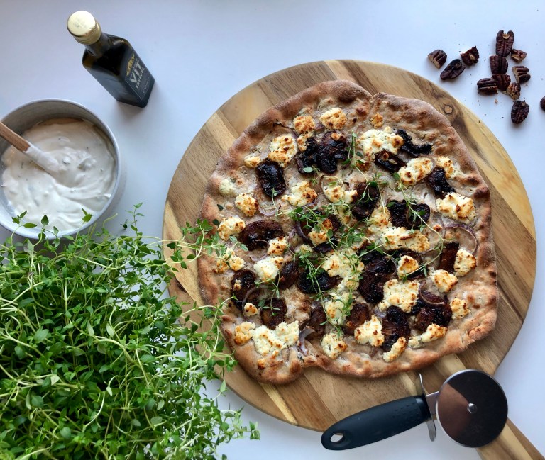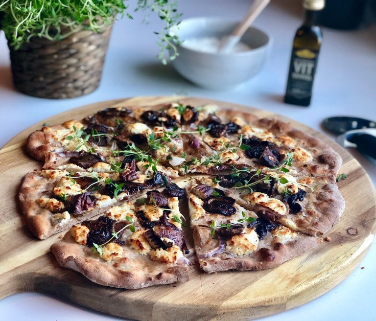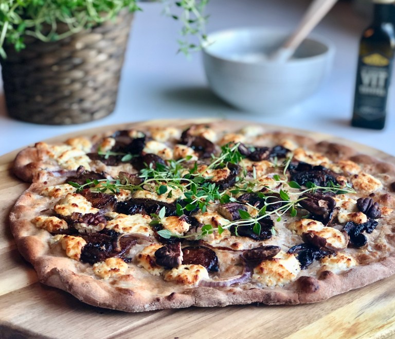 Ta de ut og legg på frisk timian og pekannøtter og server med trøffelolje til.