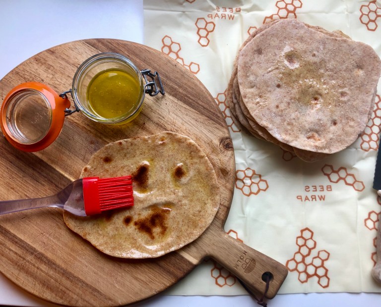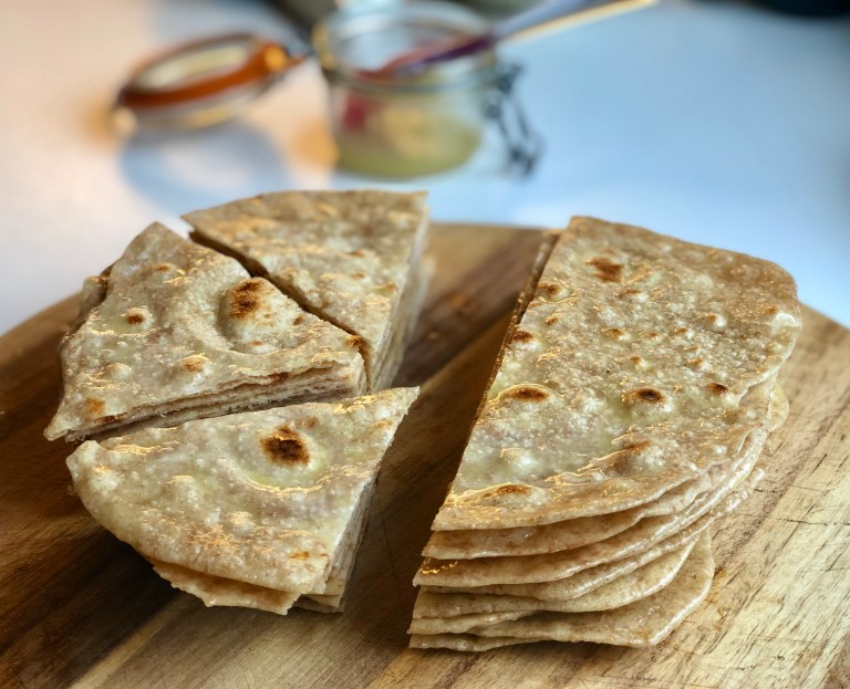 Disse har jeg laget av gårsdagens hjemmelagde halvgrove surdeigs tortillas.
