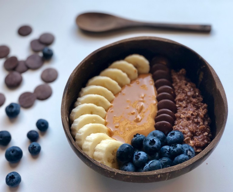 Hell det over i en skål og ha på peanøttsmør, banan, blåbær og sjokoladebiter.