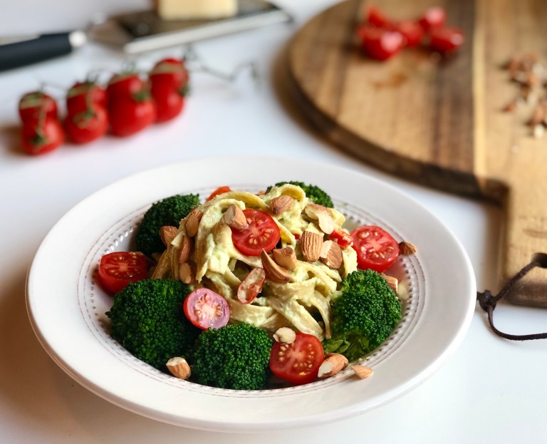 Anrett på tallerkener og legg på brokkolibuketter, tomat og ristede mandler.