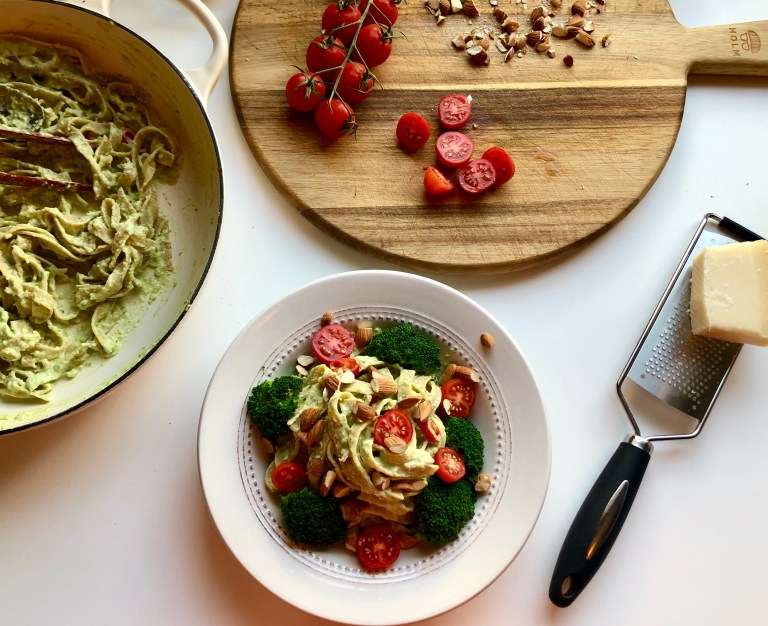Hell over avokadopestoen og strø på revet parmensan og vend alt sammen.