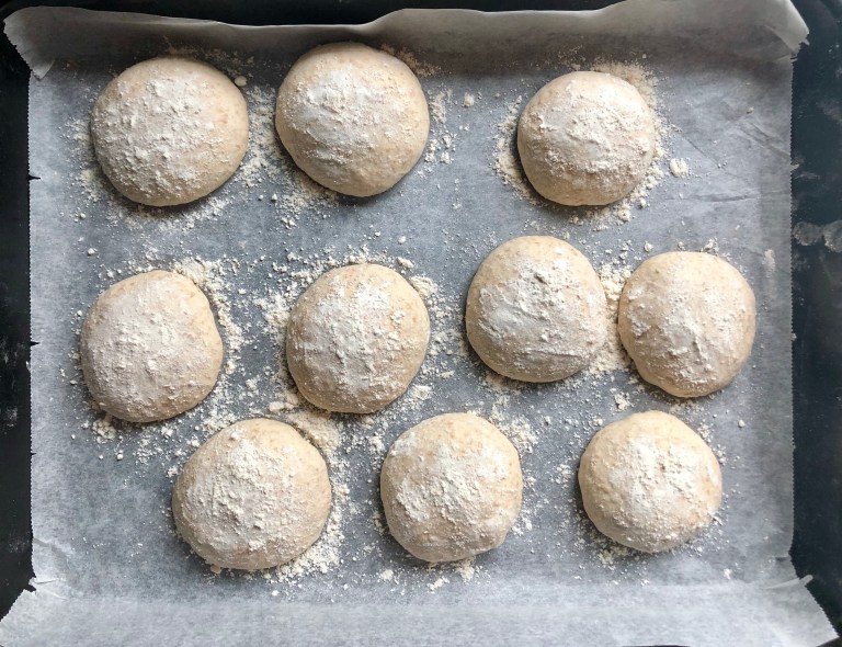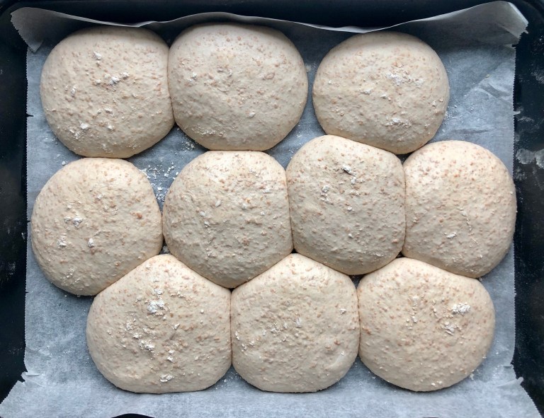 Legg de over på et bakepapirkledt stekebrett, dekk til med plastfolie og la de heve