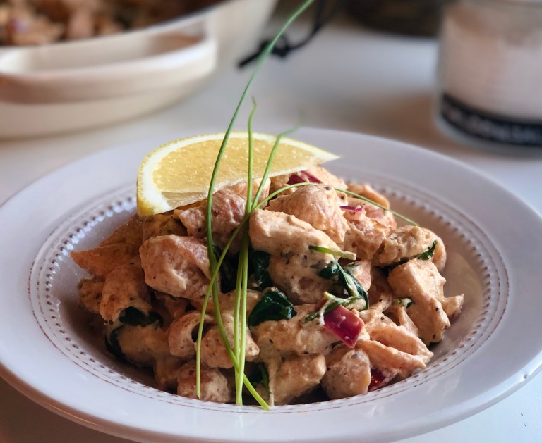 Til slutt har du kyllingen og pastaen tilbake i stekepannen.