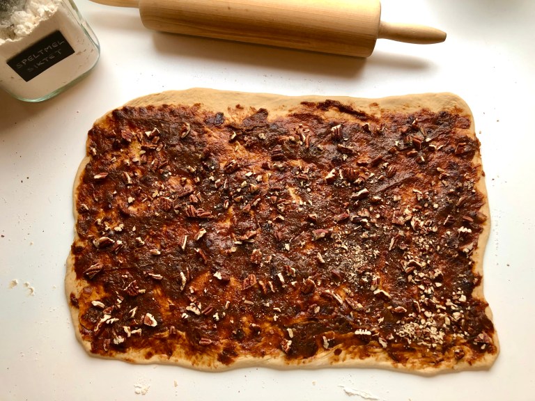 Smør på daddelfyllet og strø på pekannøtter og rull ganske stramt til en lang pølse.