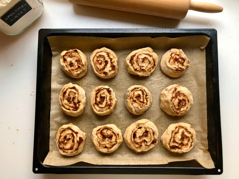 Kutt i 12 emner, sett de på et stekebrett med bakepapir og dekk til igjen med plastfolie.