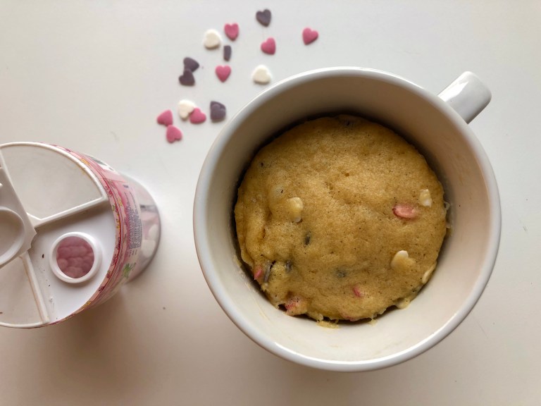 Mug cake lages raskt i en kopp og «stekes» i mikrobølgeovn.