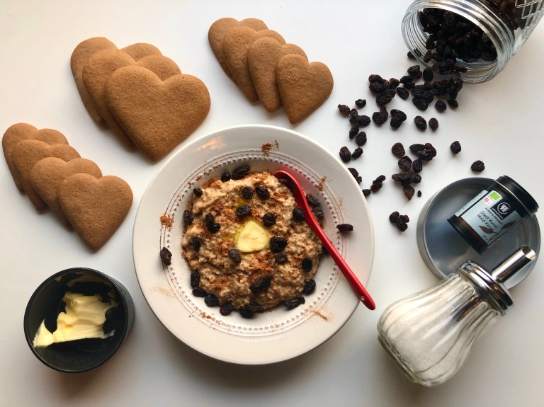 Legg på en klatt smør midt i og strø noen rosiner på. NYT!