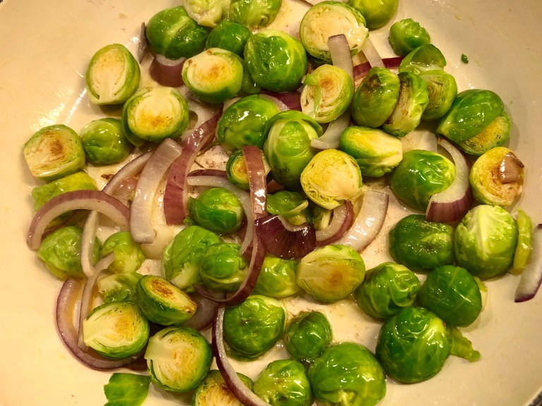 Vask og rens rosenkålen og del de i to. Kutt rødløk i ringer.