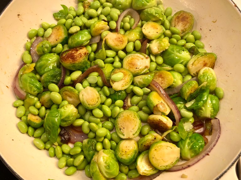 Legg i rosenkål og rødløk og stek det i 5 minutter, krydre med salt og pepper.