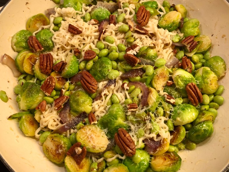 Kok eggnudler etter anvisning på pakken. Vend det inn i rosenkålblandingen.