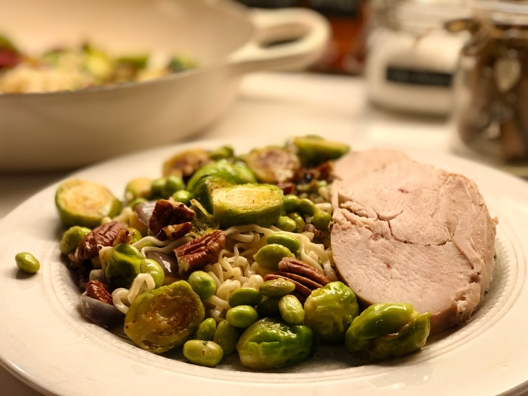 med eggnudler og skiver av saftig marinert ovnsstekt kalkunfilet.