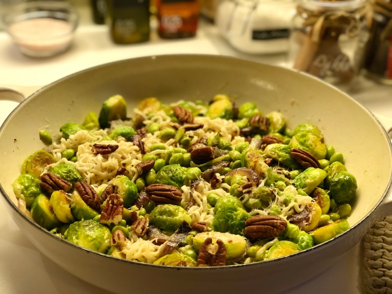 Kok eggnudler etter anvisning på pakken. Vend det inn i rosenkålblandingen.