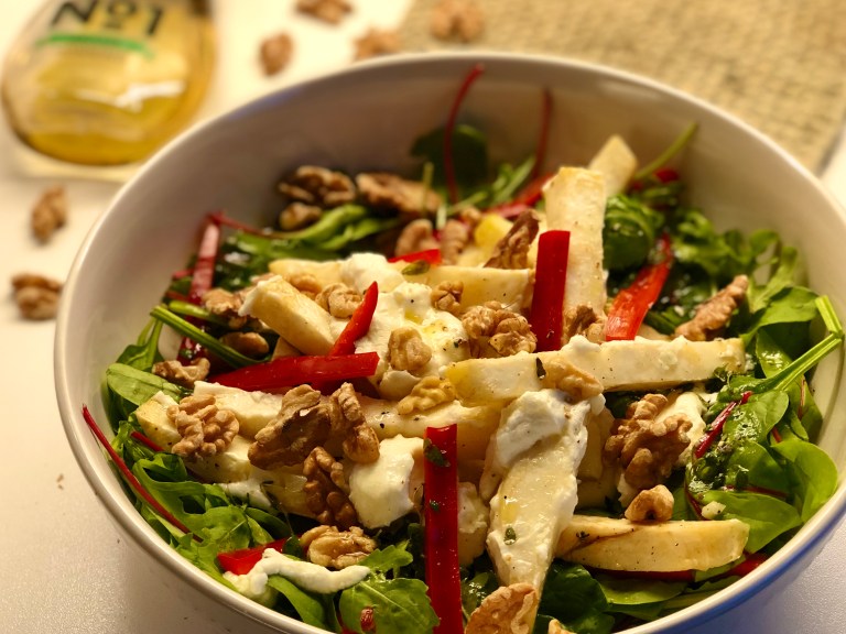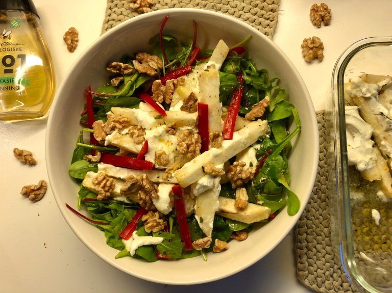Legg på varm ovnsbakt sellerirot og chevre og risle over dressingen.