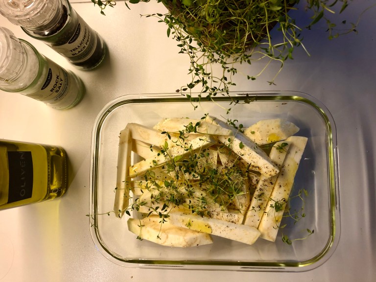 Skrell selleriroten og kutt i staver. Ha det i en liten ildfast form sammen med timian.
