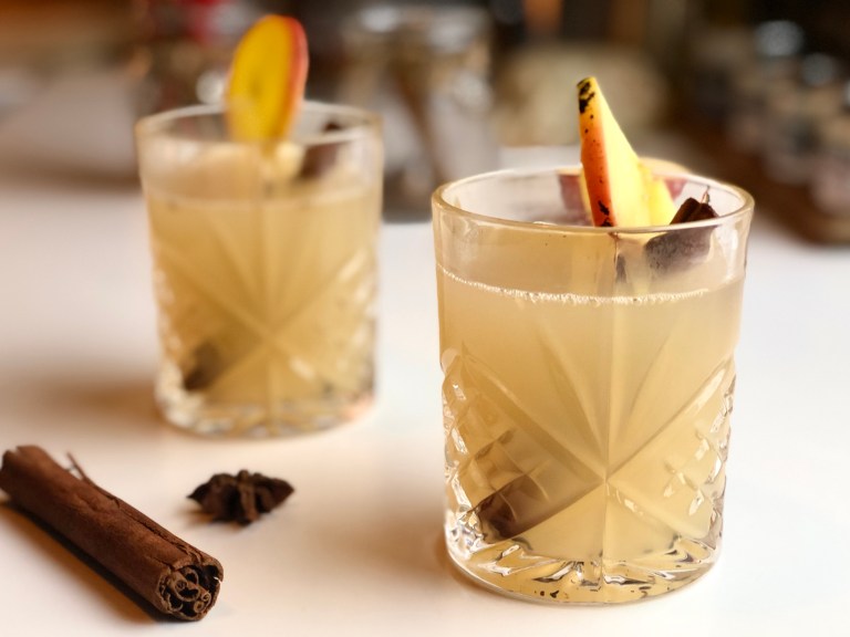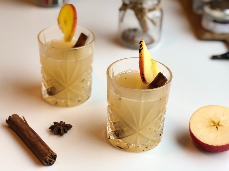 Bruk en øse å helle over i glass og server med en epleskive i.