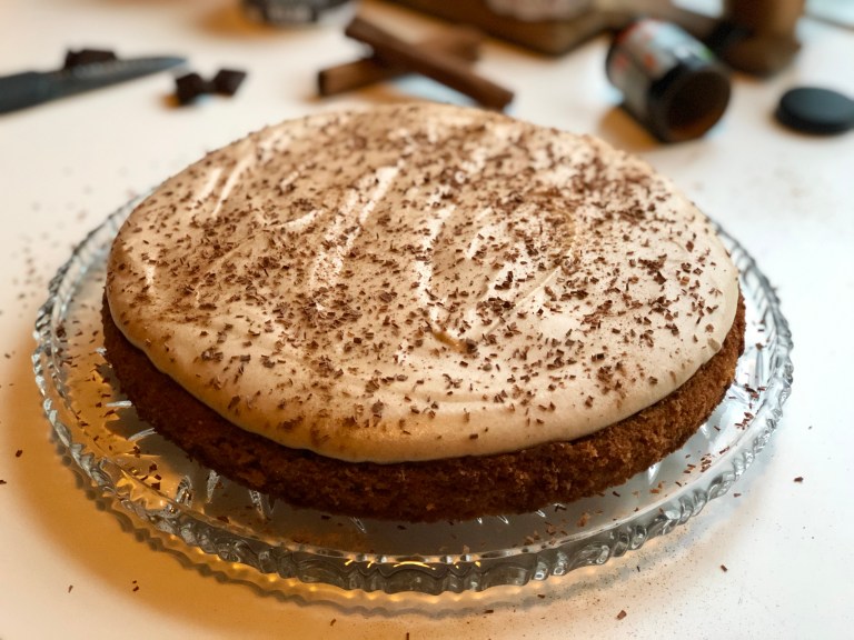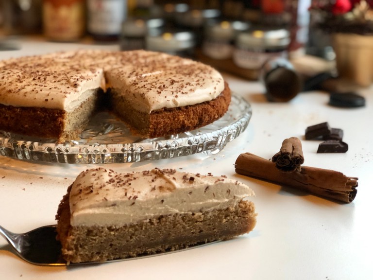 En nydelig krydderkake med den beste cinnamon cream cheese frosting.