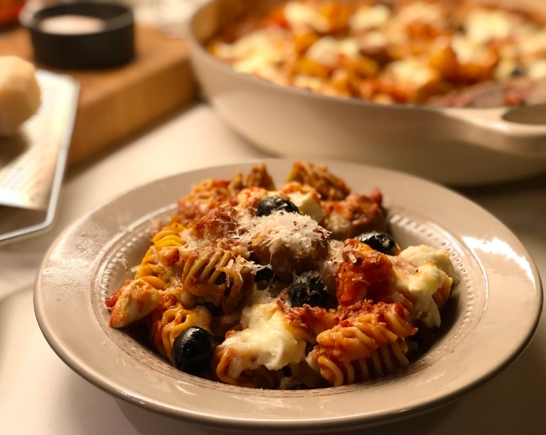 Gratinert pasta med chorizo og fetaost i tomatsaus