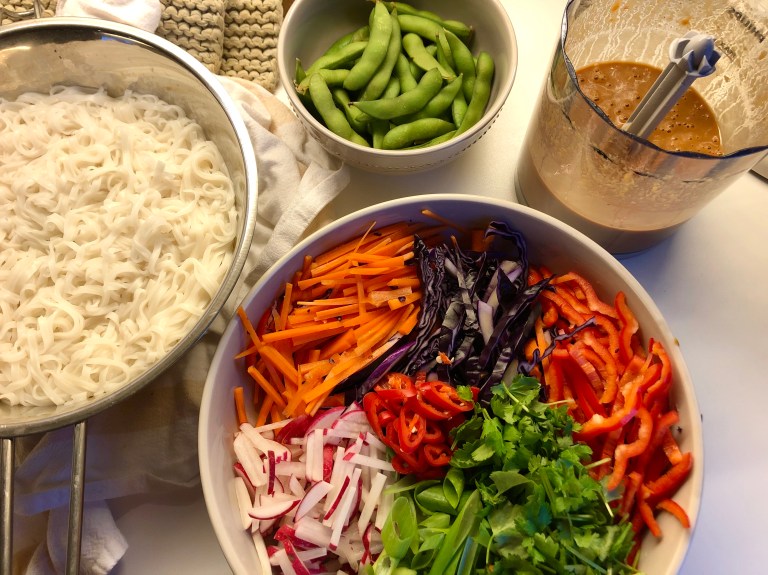 Ha risnudlene i en stor bolle og hell over ca. 1/3 av peanøttdressingen.