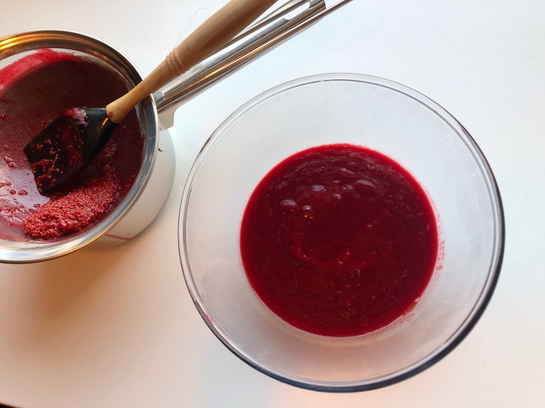 Kjør det sammen med en stavmikser. Sil coulisen så du får bort alle frøene.