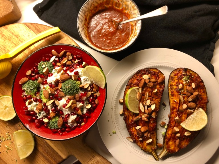 Server nystekt og varm aubergine med brokkolisalat, dip og godt brød.
