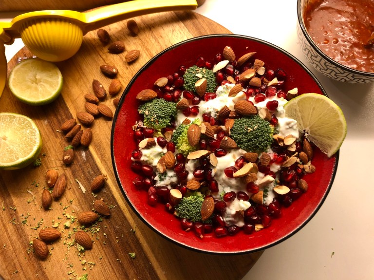 Ha det over i en serveringsbolle og strø over granateplekjerner og mandlene.