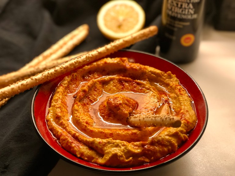 Her har jeg servert søtpotethummus til grissini med sesamfrø som kveldskos.