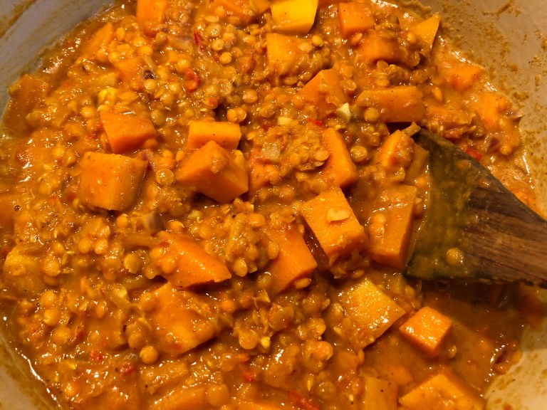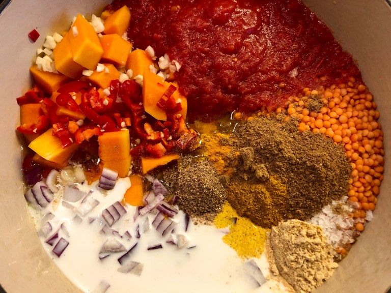 platen til det putrer. La det putre i 1 times tid, til flaskegresskaret og linsene er møre.