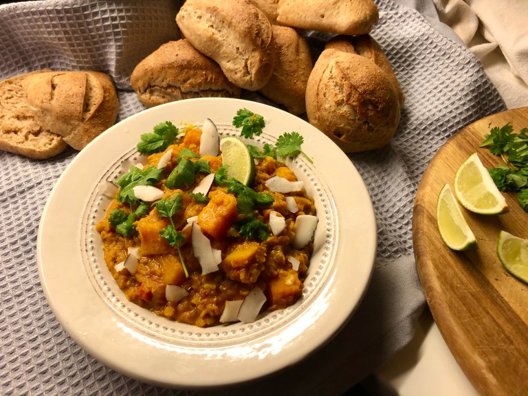 Server med kokosflak, limebåter, grovhakket frisk koriander og godt brød!