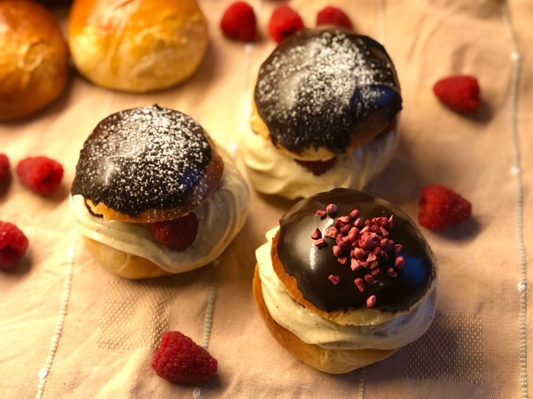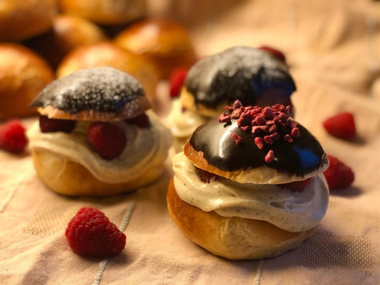 til disse nydelige fastelavnsbollene med vaniljekrem og sjokoladetrekk.