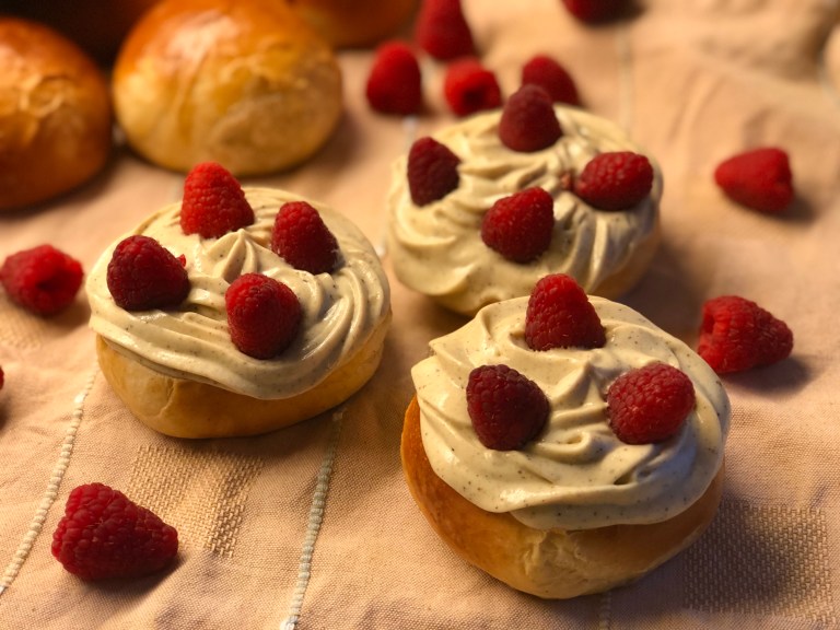 På bunnene sprøytes godt med vaniljekrem og legg på friske bringebær.