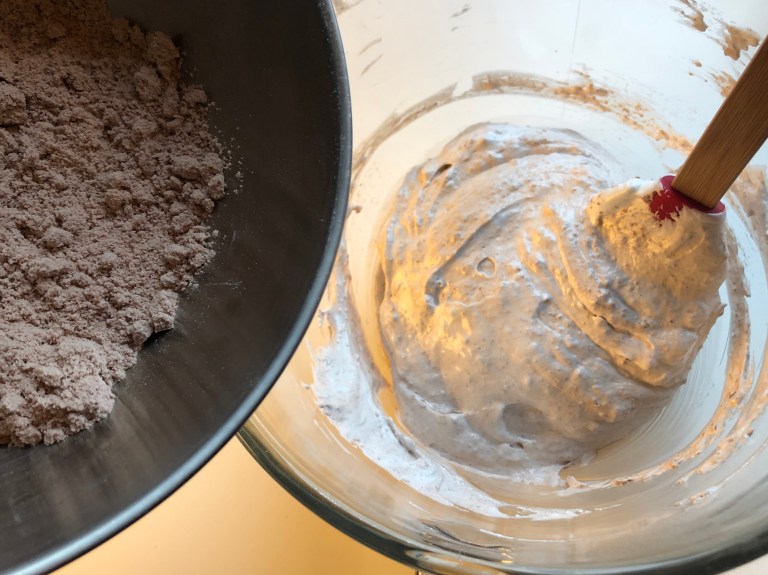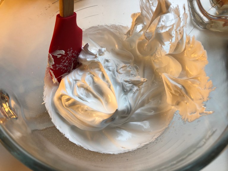 Ha halvparten over marengsen og vend inn før du har i resten og vender inn.