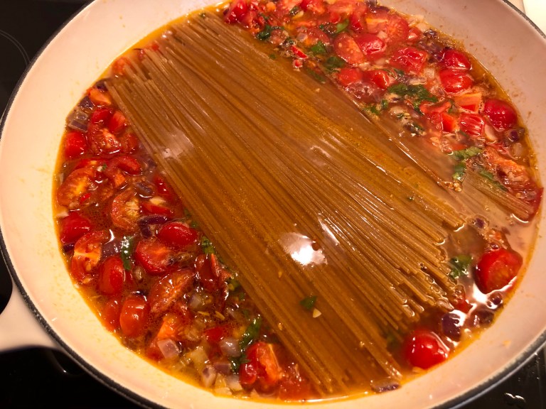 One pan (eller pot) pasta er enkelt og greit å lage, alt er i samme gryte.