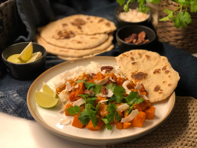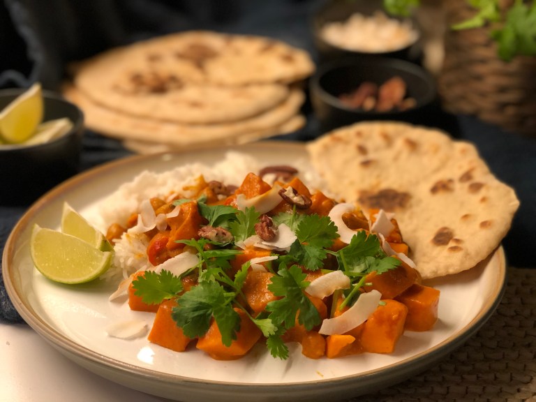 Server med basmatiris, ristede kokosflak, limebåter, grovhakket frisk koriander og