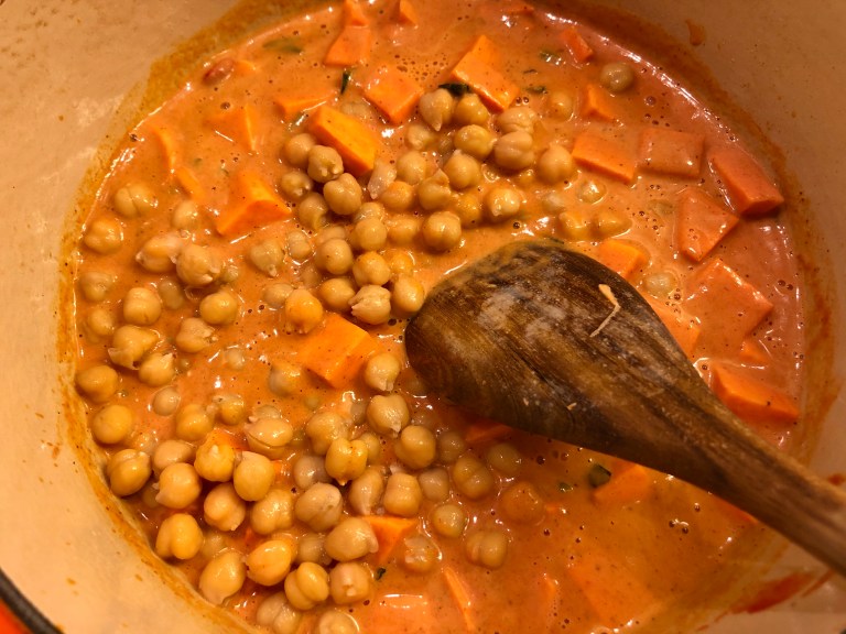Tilsett kokosmelk, søtpotet og kikerter i gryten, kok opp og sett ned