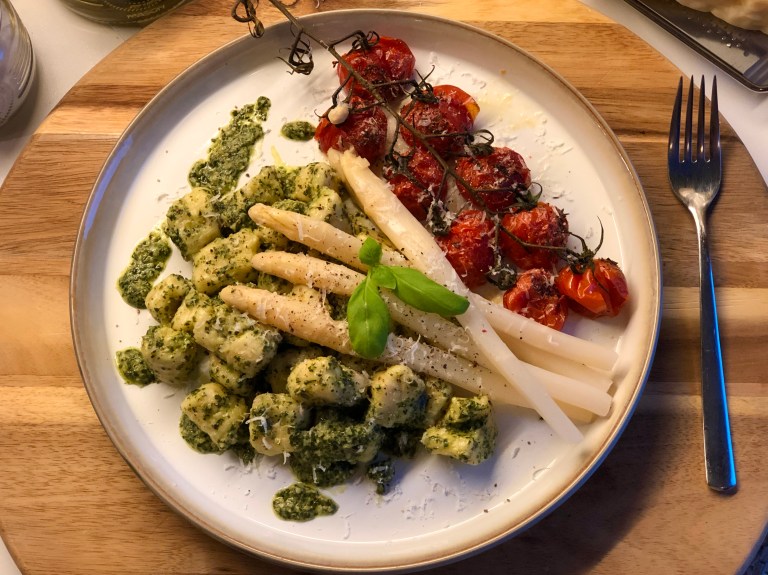 Fordel på 2 tallerkener med hvit asparges og ovnsbakte cherrytomater til.