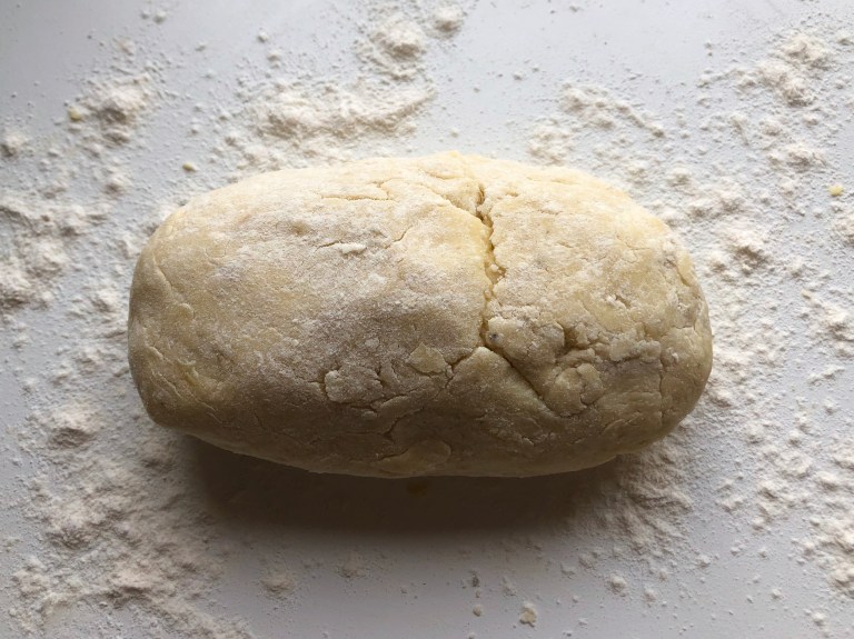 Lag en fordypning midt i potet/melblandingen, tilsett pisket egg og